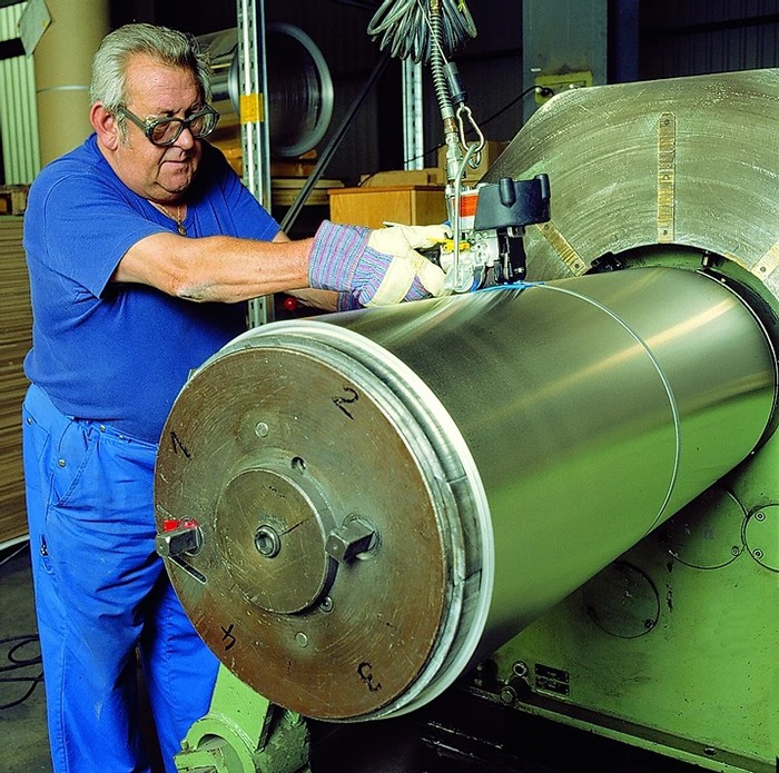 · 氣動馬達束緊與咬扣,適用曲面包裝物(如管材、鋼卷等)打包。