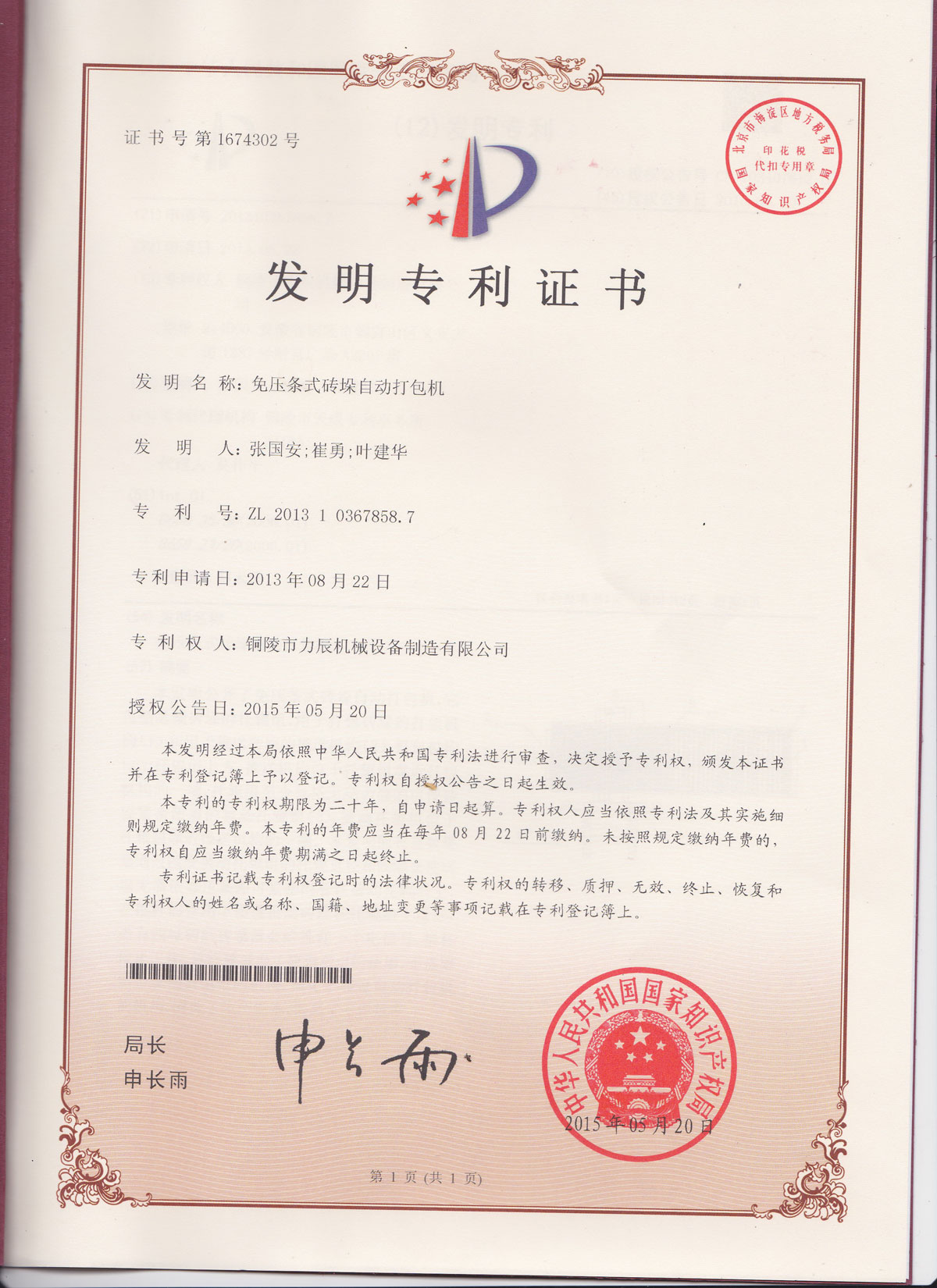 2015-06-13銅陵力辰機械近日榮獲國家專利局頒發(fā)新專利證書,該項發(fā)明專利技術(shù)極大的為客戶節(jié)約了包裝成本,并有利于公司充分發(fā)揮自主知識產(chǎn)權(quán)的優(yōu)勢,增強公司的核心競爭力...